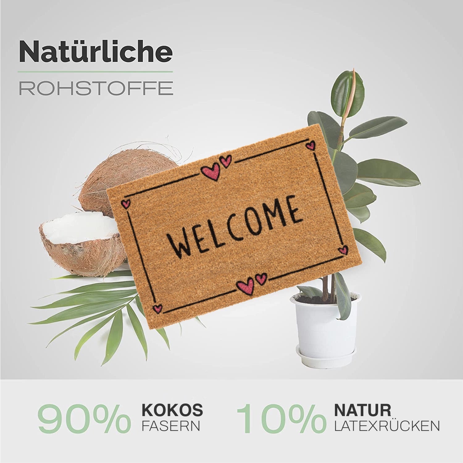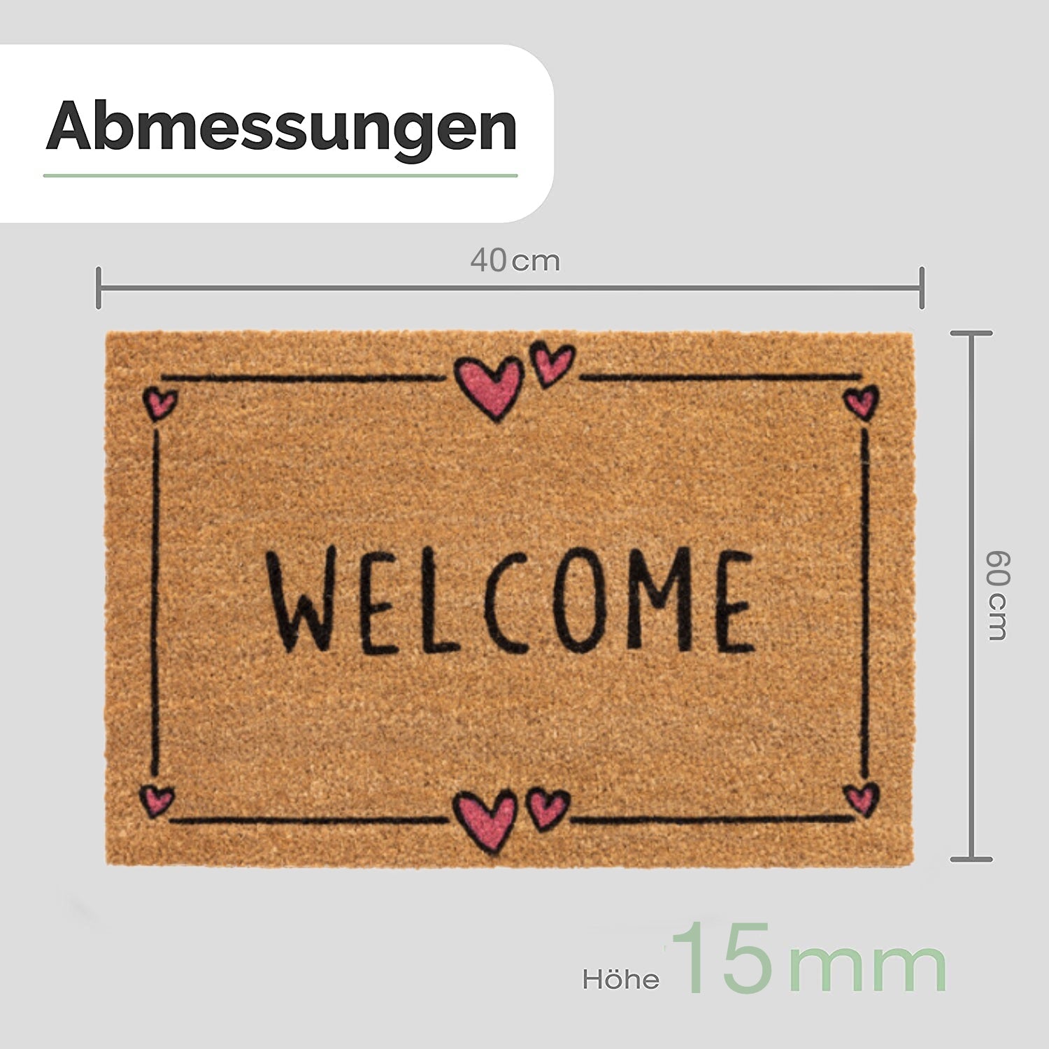 Natürliche Fussmatte aus Kokos mit Welcome Schriftzug und einen Rahmen, der mit rosa Herzen verziert ist - ideal für den Eingang