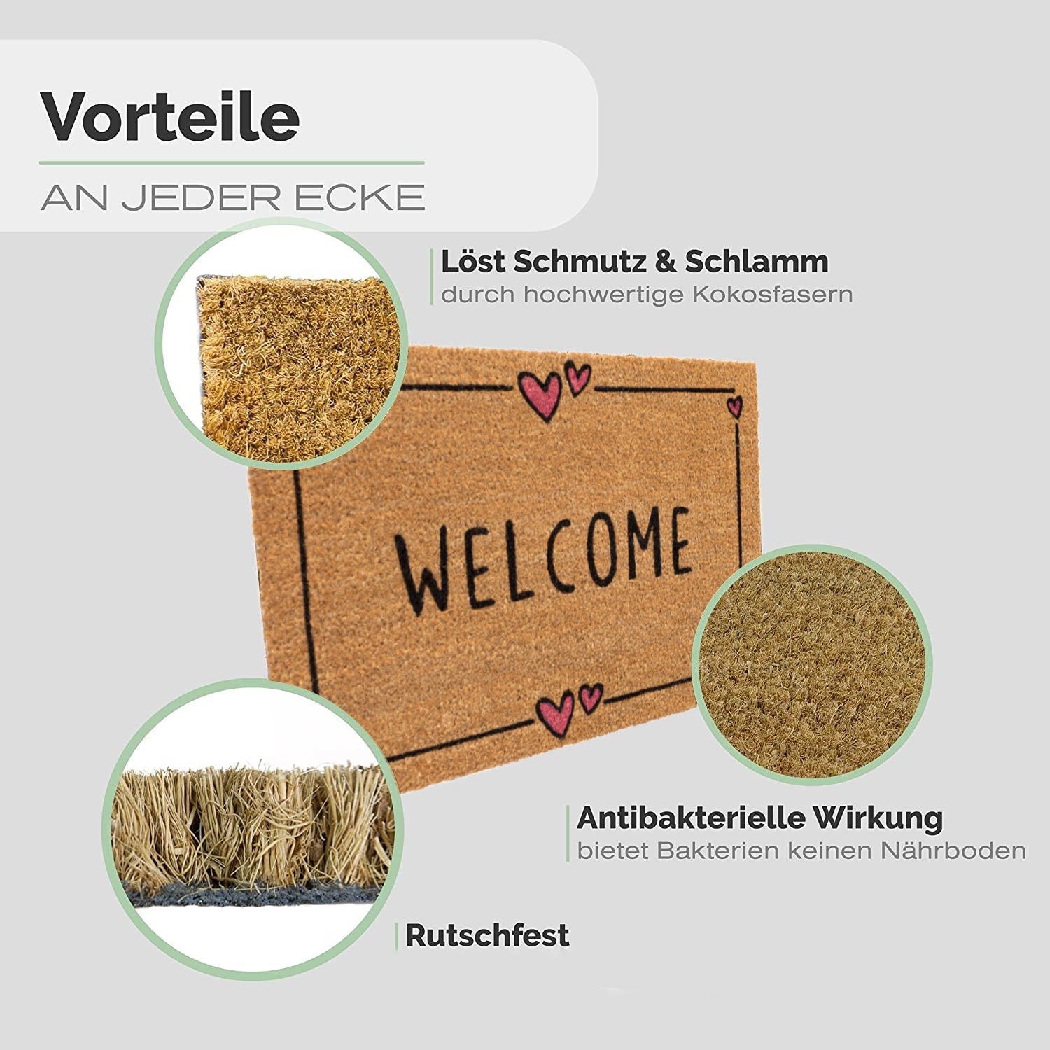 Doch diese Matte ist mehr als nur ein Augenschmaus. Hergestellt aus hochwertigen, natürlichen Kokosfasern, bietet sie eine robuste Oberfläche, die effektiv Schmutz und Feuchtigkeit abfängt, bevor diese in Ihr Zuhause gelangen. Die rutschfeste Unterlage garantiert dabei, dass die Matte sicher an ihrem Platz bleibt – für einen sicheren ersten Schritt in Ihr Heim.