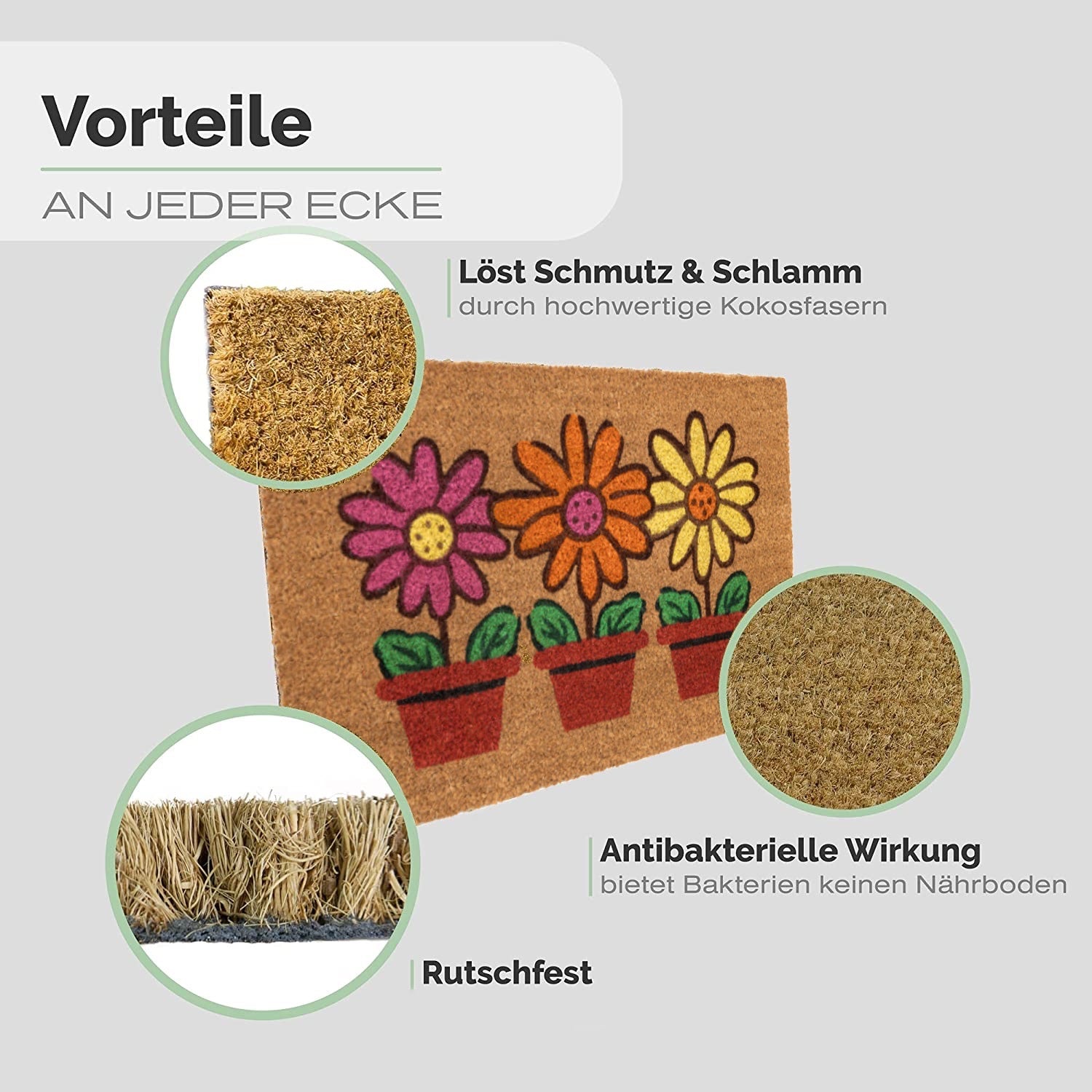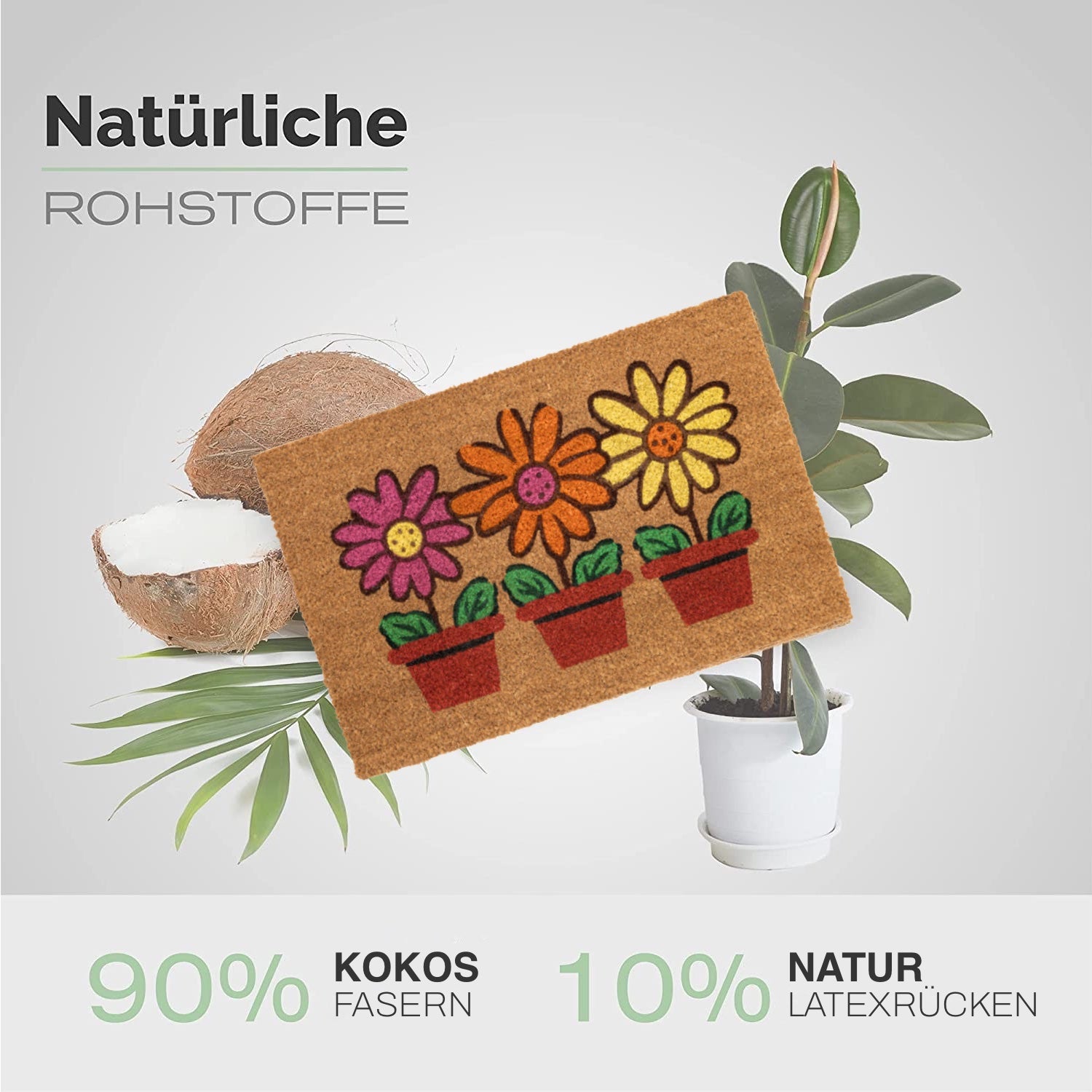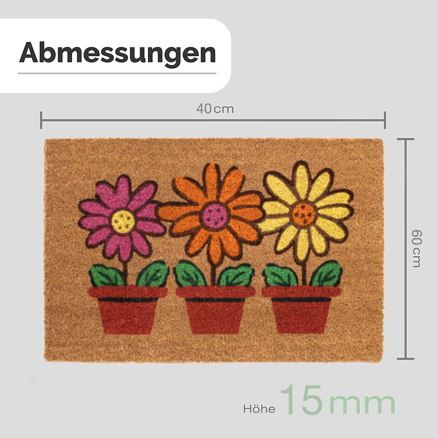 Verleihen Sie Ihrem Eingangsbereich einen Hauch von Natürlichkeit und Farbe mit unserer Kokos-Fußmatte, die charmant drei bunte Blumen in Töpfen präsentiert. Diese Fußmatte ist nicht nur ein visueller Hingucker, sondern überzeugt auch durch ihre Funktionalität.