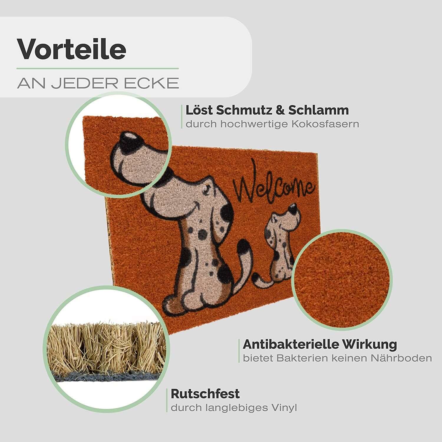 Willkommen in Ihrem neuen Zuhause der Hunde-Liebe! Diese Fußmatte aus Kokosfasern ist die perfekte Begrüßung für Sie und Ihre Gäste. Das Hundemotiv und die Welcome Aufschrift sind ein echter Hingucker und lassen Ihren Eingangsbereich direkt viel freundlicher wirken. Die Fußmatte ist außerdem besonders robust und wetterfest. Eine ideale Geschenkidee für Hundeliebhaber und ein toller Blickfang für Ihren Eingangsbereich.