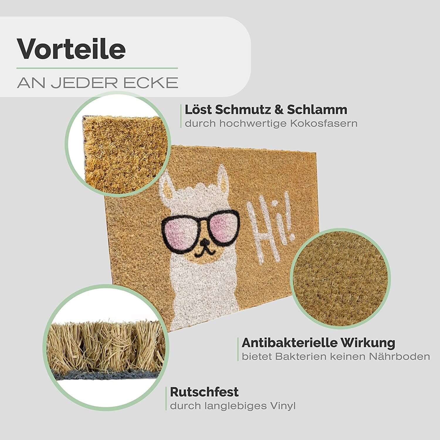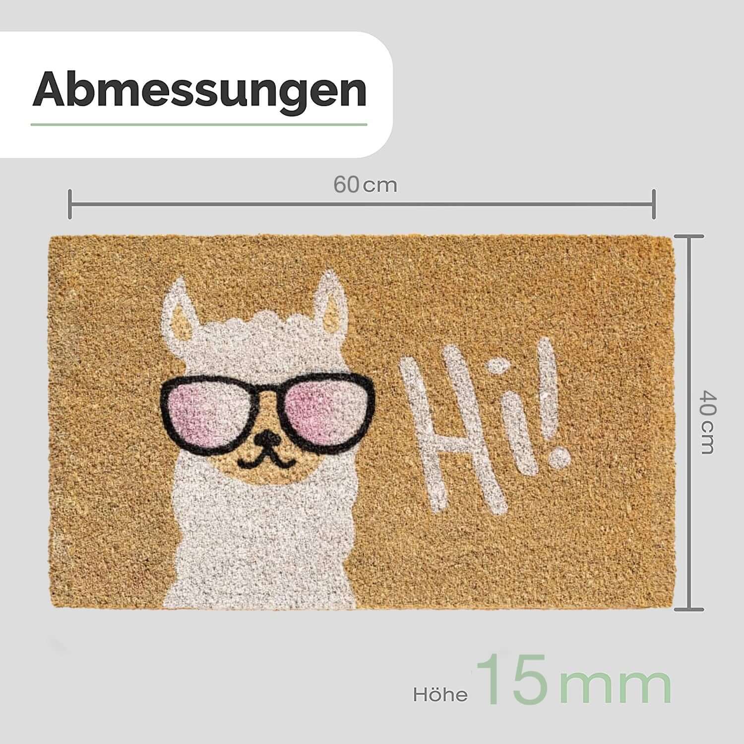 Die Fußmatte aus Kokos mit Motiv ist eine tolle Ergänzung für Ihre Wohnung oder Ihr Büro. Die Fußmatte ist nicht nur stylish, sondern auch sehr praktisch. Sie ist aus hochwertigem Kokos gefertigt und hat ein cooles Lama mit Sonnenbrille als Motiv. Die Fußmatte ist auch mit der Aufschrift Hi! versehen.
