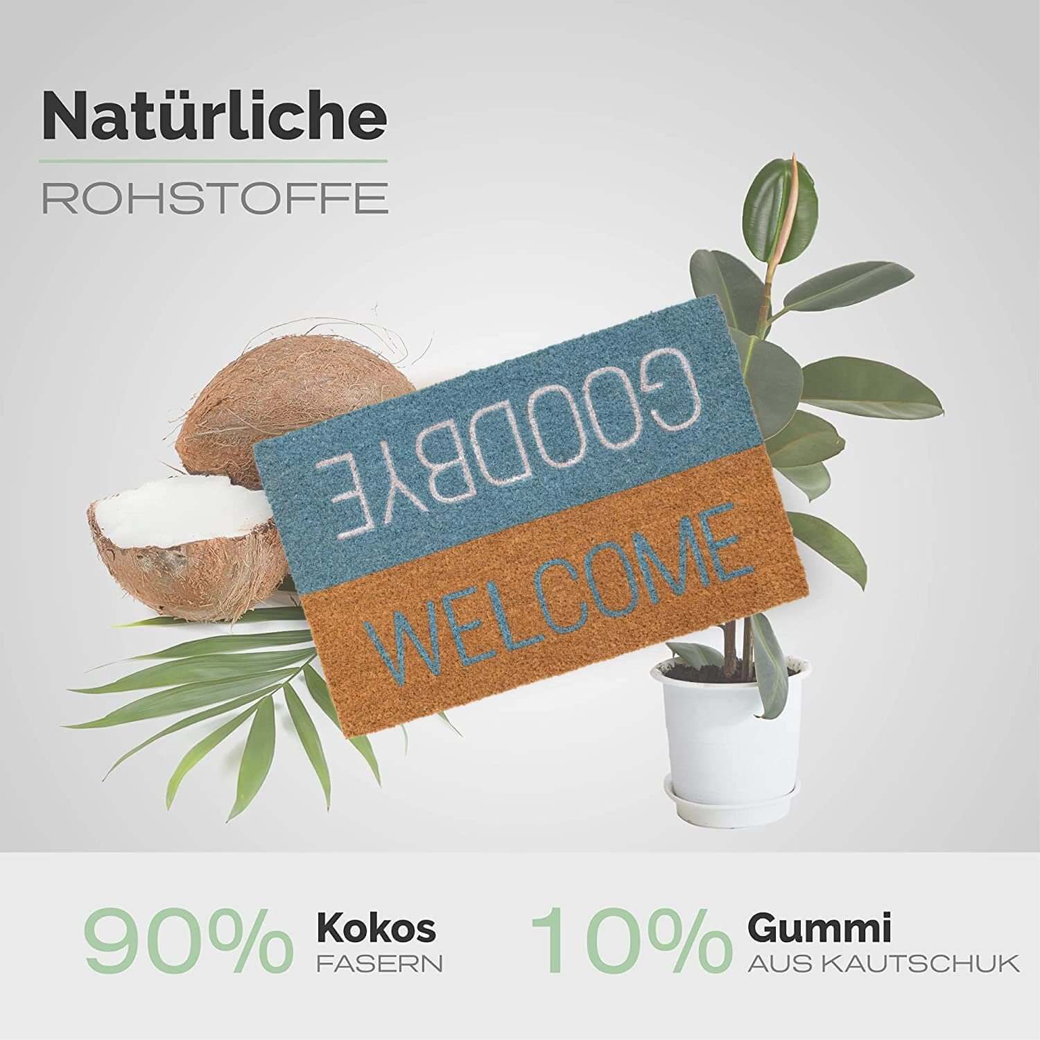 Fußmatte aus Kokos mit einem Goodbye & Welcome-Motiv in blau-braunen Farben - ideal für den Eingang