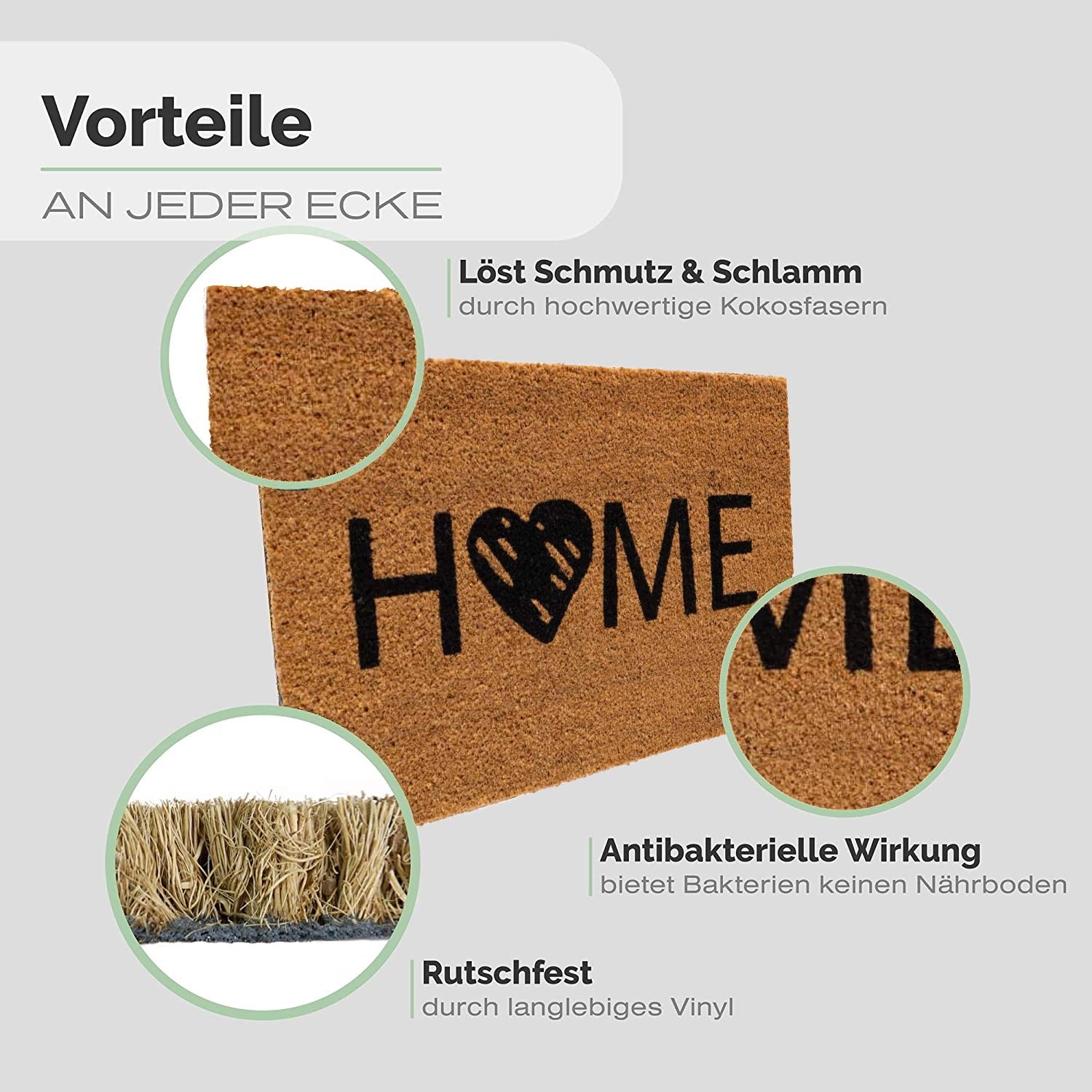 Nicht nur optisch, sondern auch in Bezug auf die Funktionalität überzeugt die Matte: Die Kokos-Fasern machen sie extrem strapazierfähig und pflegeleicht, während sie gleichzeitig rutschfest und antibakteriell ist. So wird verhindert, dass Schmutz und Feuchtigkeit in Ihr Zuhause gelangen und Ihr Fußboden geschützt bleibt.