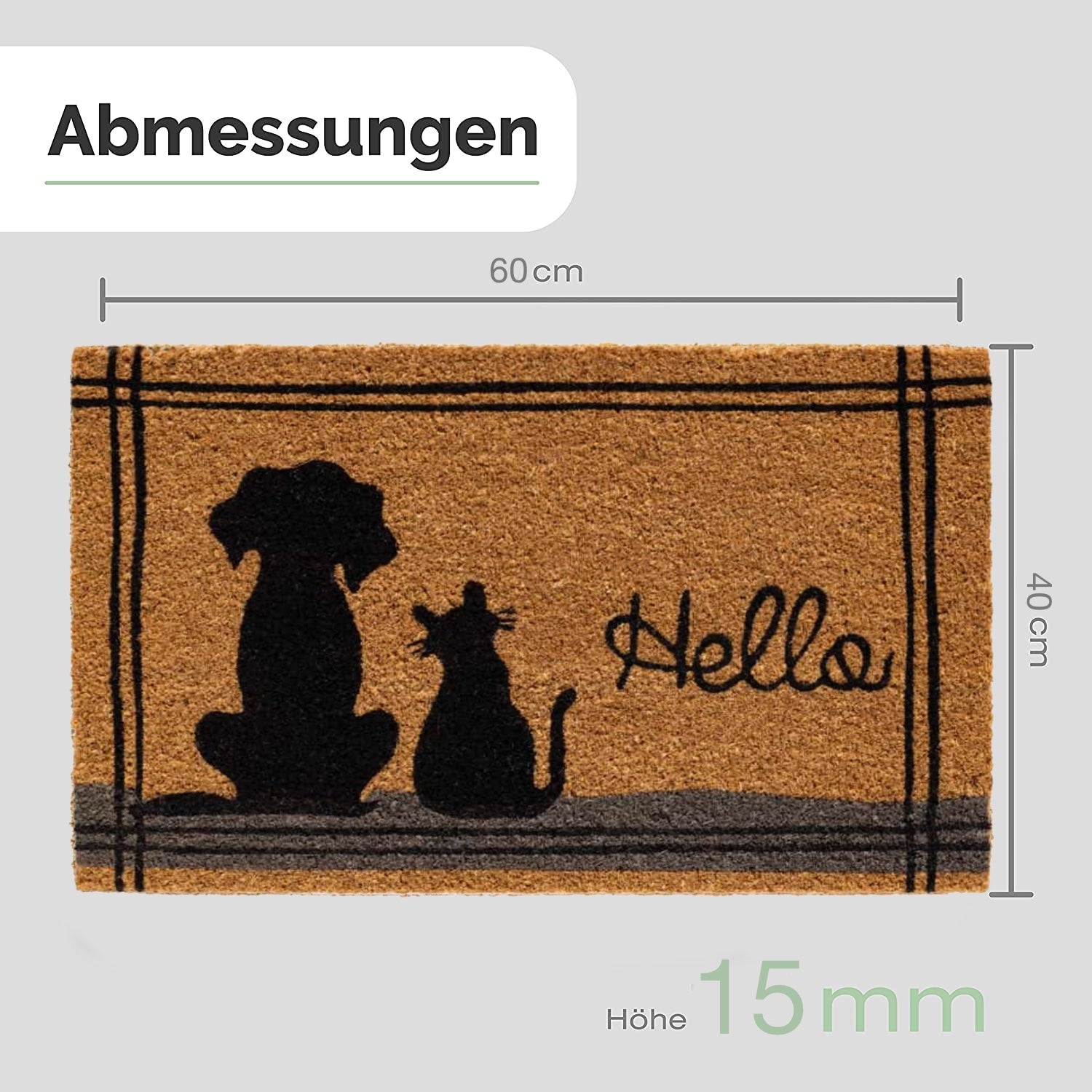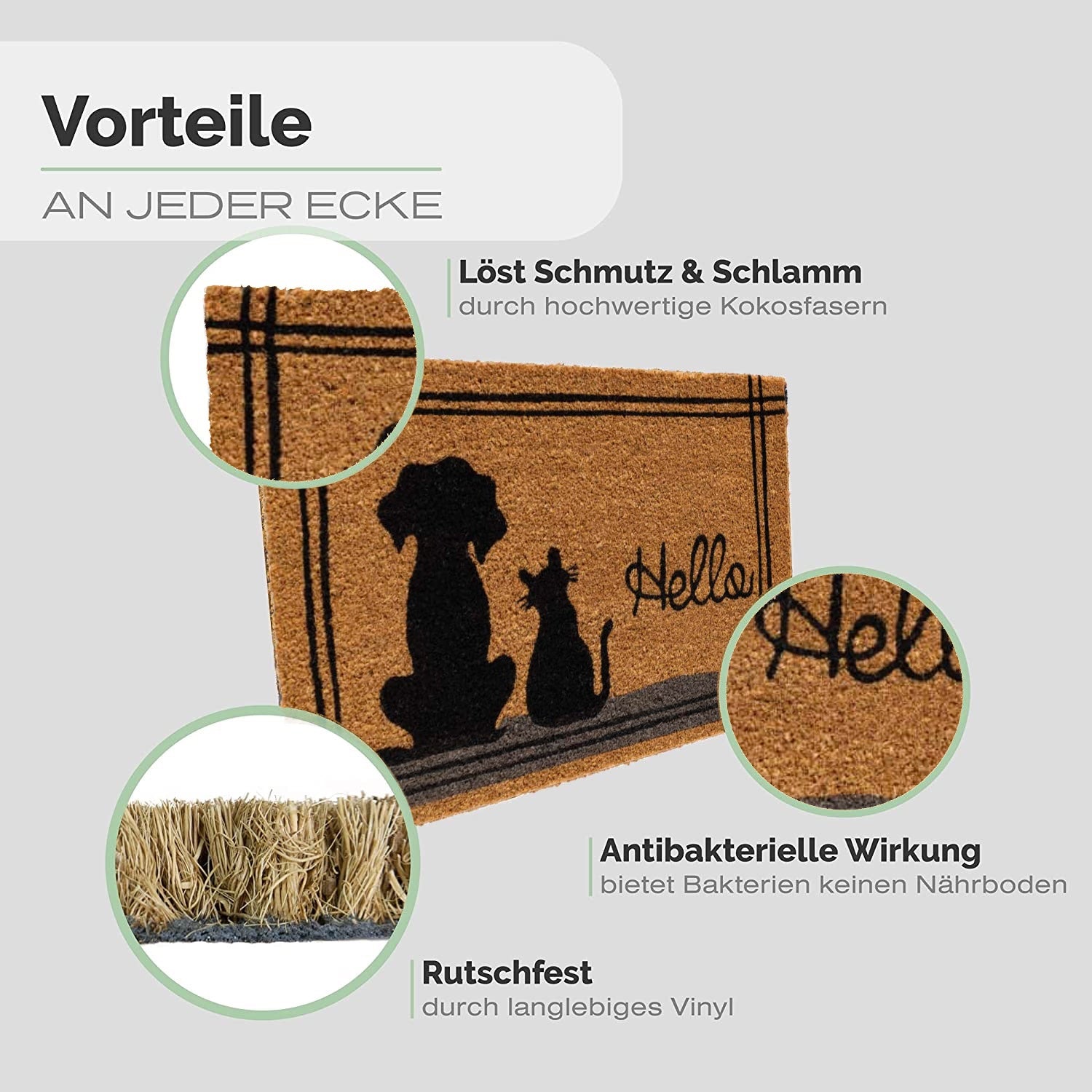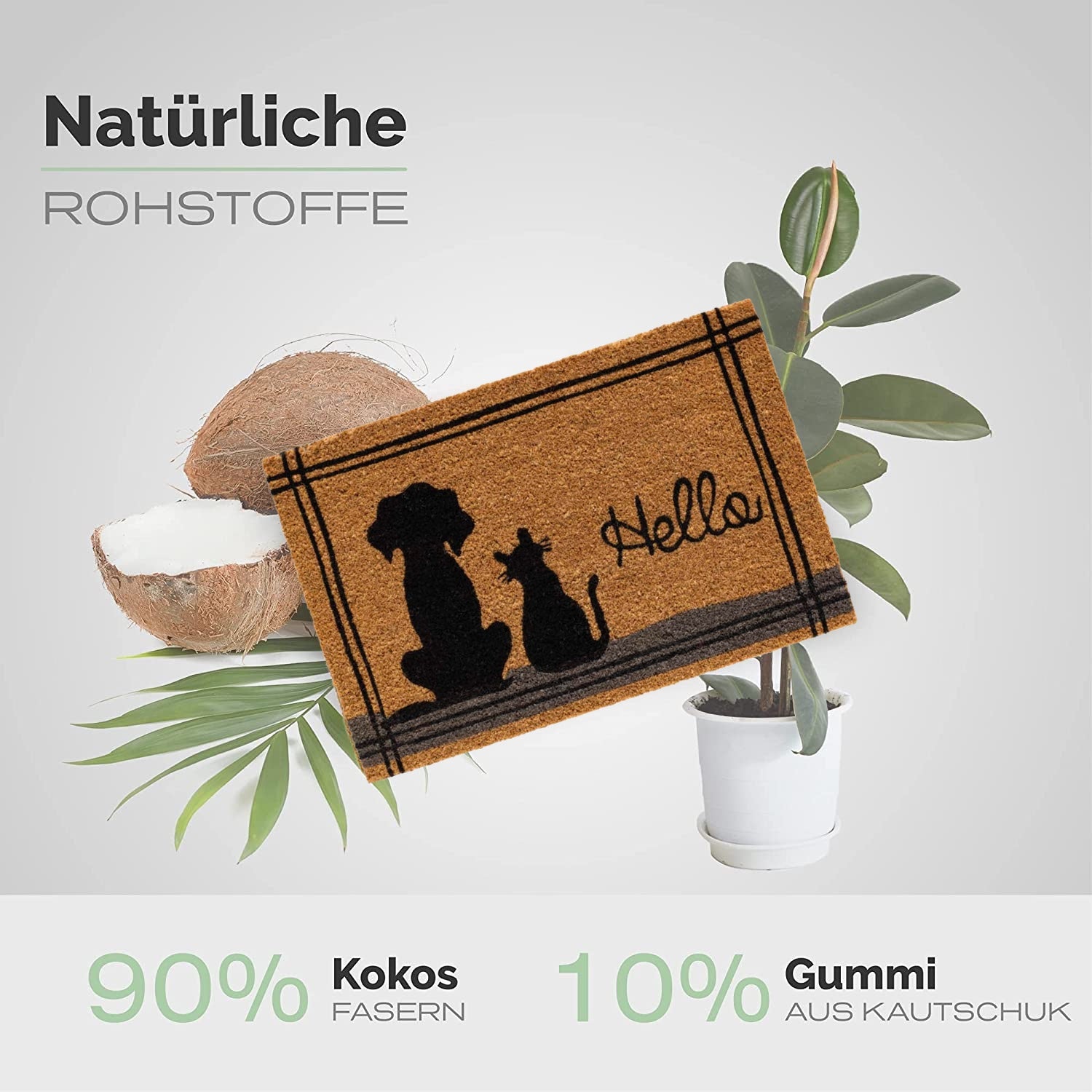 Mit unserer Kokos-Fußmatte mit dem süßen Motiv eines sitzenden Hundes und einer Katze sowie dem freundlichen Schriftzug "Hello" begrüßen Sie Ihre Gäste auf stilvolle Weise. Aber diese Matte ist mehr als nur ein hübsches Accessoire - sie ist auch äußerst funktional!