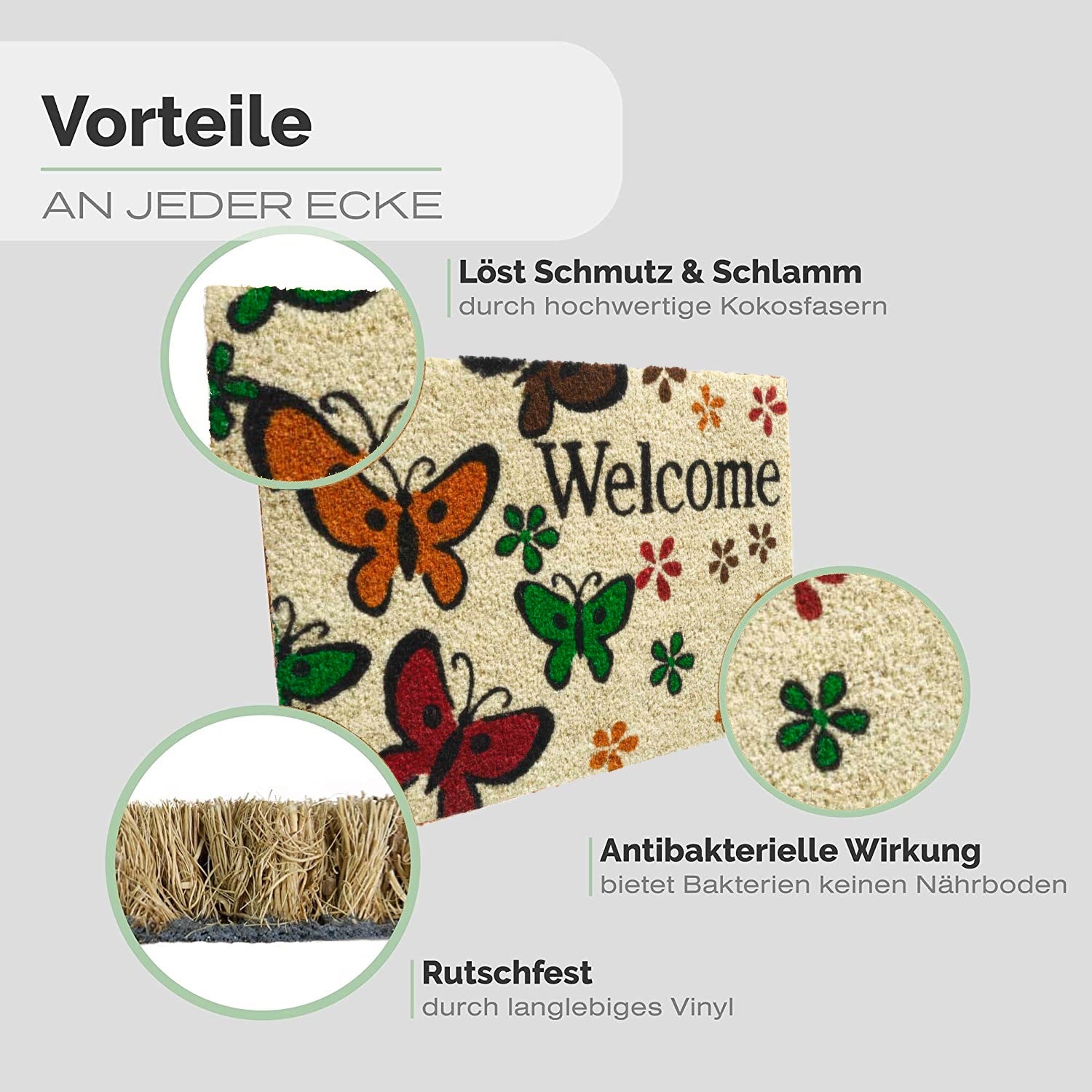 Diese wunderschöne Kokos-Fußmatte mit einem bunten Schmetterlingsmotiv und dem Schriftzug "Welcome" ist der perfekte Weg, um Ihre Gäste willkommen zu heißen. Diese Matte ist nicht nur ein Blickfang, sondern auch äußerst funktional. Die rutschfeste Oberfläche bietet Ihnen und Ihren Gästen einen sicheren Halt, während die pflegeleichte und antibakterielle Beschaffenheit dafür sorgt, dass diese Fußmatte immer sauber und hygienisch bleibt. Darüber hinaus hält sie Schmutz und Feuchtigkeit vom Eingang fern und sorgt so dafür, dass Ihre Böden immer sauber bleiben.
