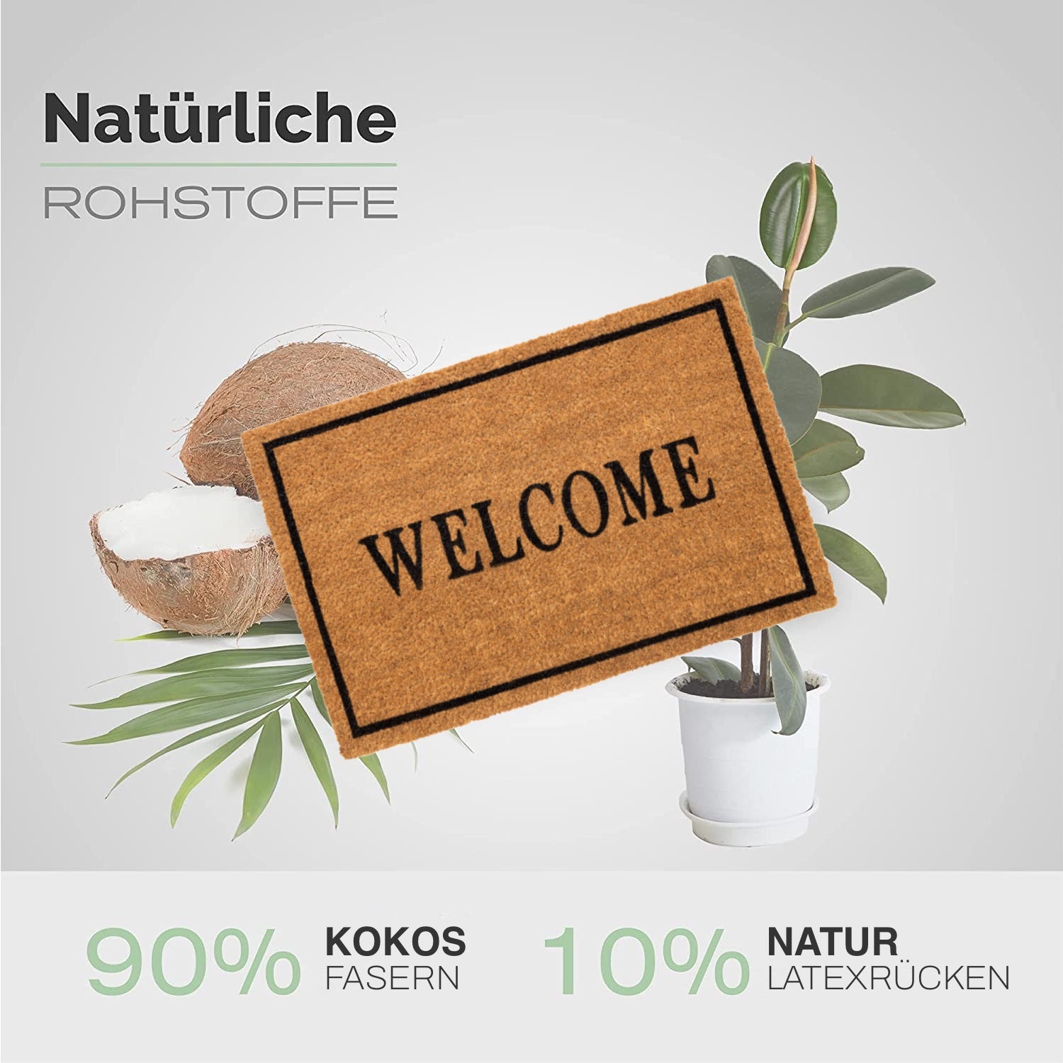 Hergestellt aus hochwertigen Kokosfasern, zeichnet sich unsere Fußmatte durch ihre außergewöhnliche Langlebigkeit und ihre natürliche Widerstandsfähigkeit gegen Schmutz und Feuchtigkeit aus. Die rutschfeste Unterlage gewährleistet dabei jederzeit sicheren Stand und vermindert das Risiko von Ausrutschern, sodass Ihr Eingangsbereich stets sicher und einladend bleibt.