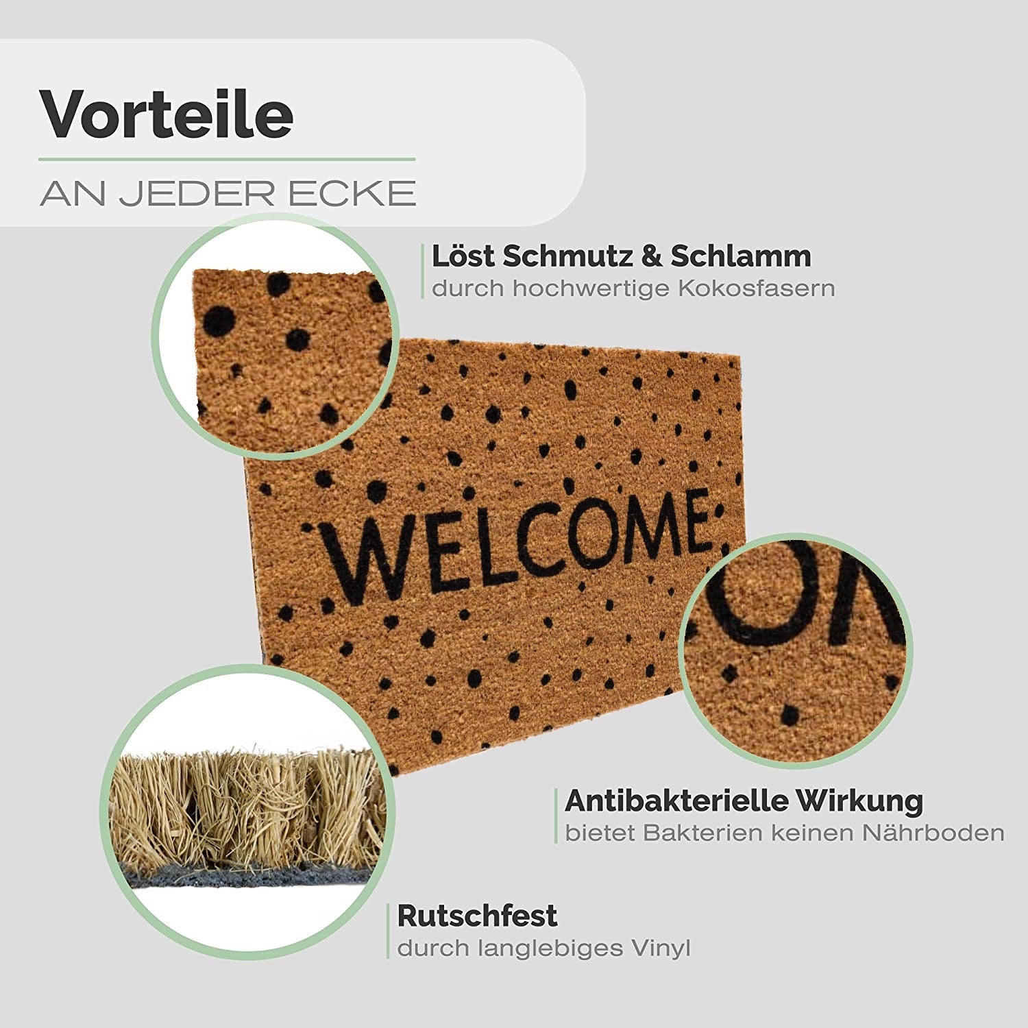 Hergestellt aus hochwertigen Kokosfasern, zeichnet sich unsere Fußmatte durch ihre außergewöhnliche Langlebigkeit und ihre natürliche Widerstandsfähigkeit gegen Schmutz und Feuchtigkeit aus. Die rutschfeste Unterlage gewährleistet dabei jederzeit sicheren Stand und vermindert das Risiko von Ausrutschern, sodass Ihr Eingangsbereich stets sicher und einladend bleibt.