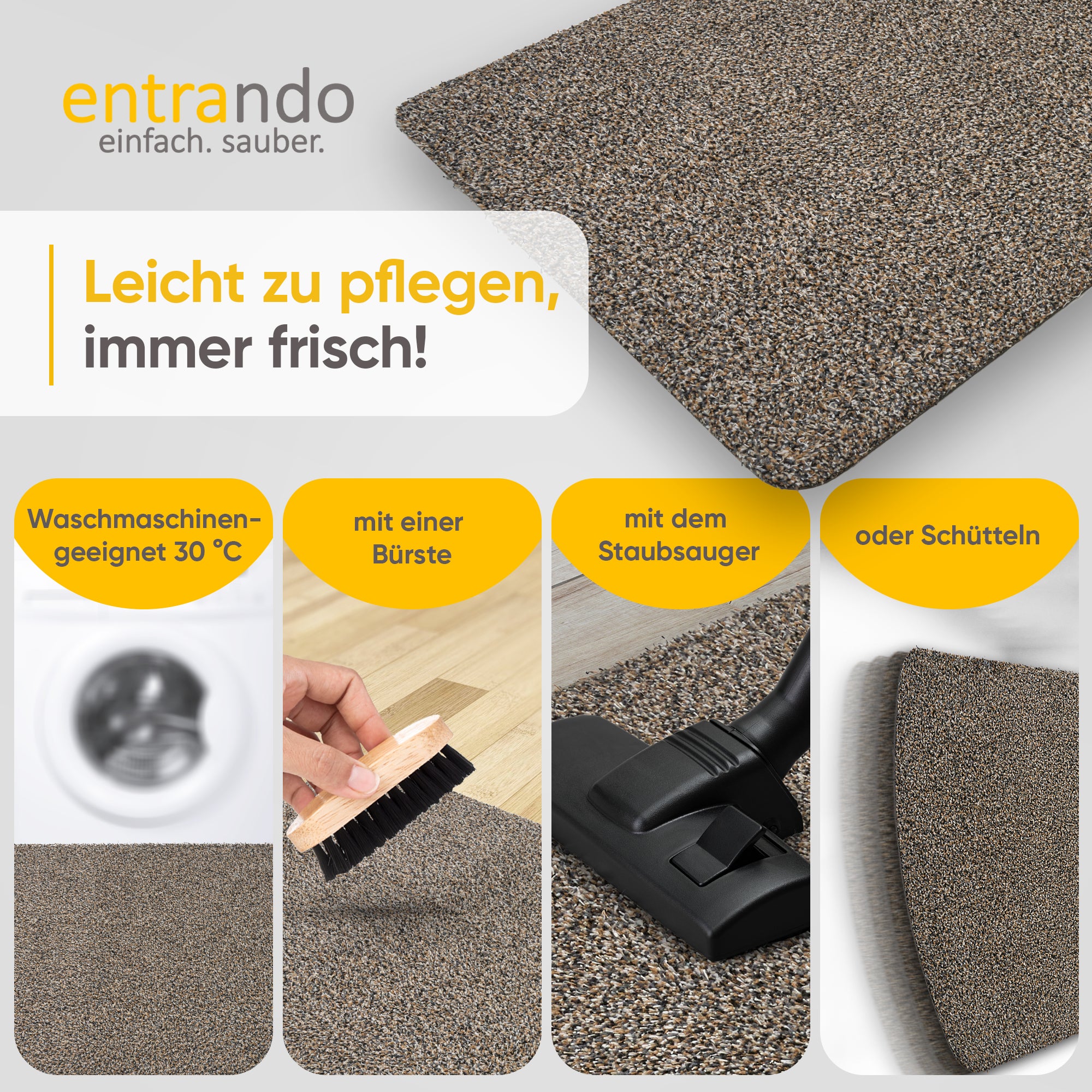 Die besten Fußmatten zeichnen sich durch ihre Effizienz in der Aufnahme von Schmutz und Feuchtigkeit sowie durch ihre einfache Reinigung aus. Unsere ENTRANDO-Eingangsmatten, bestehend aus 80 % Baumwolle und 20 % Polyester, erfüllen diese Anforderungen perfekt.