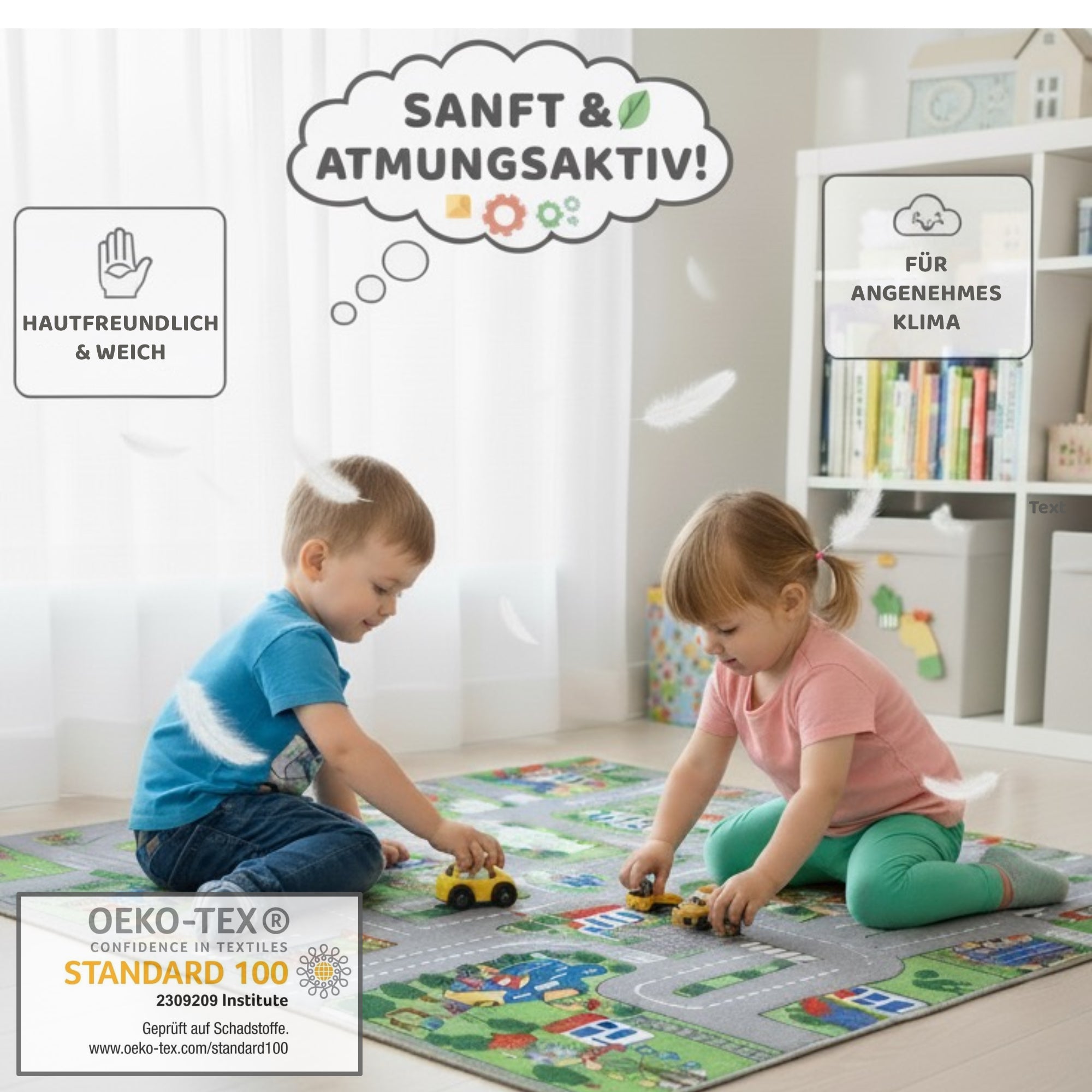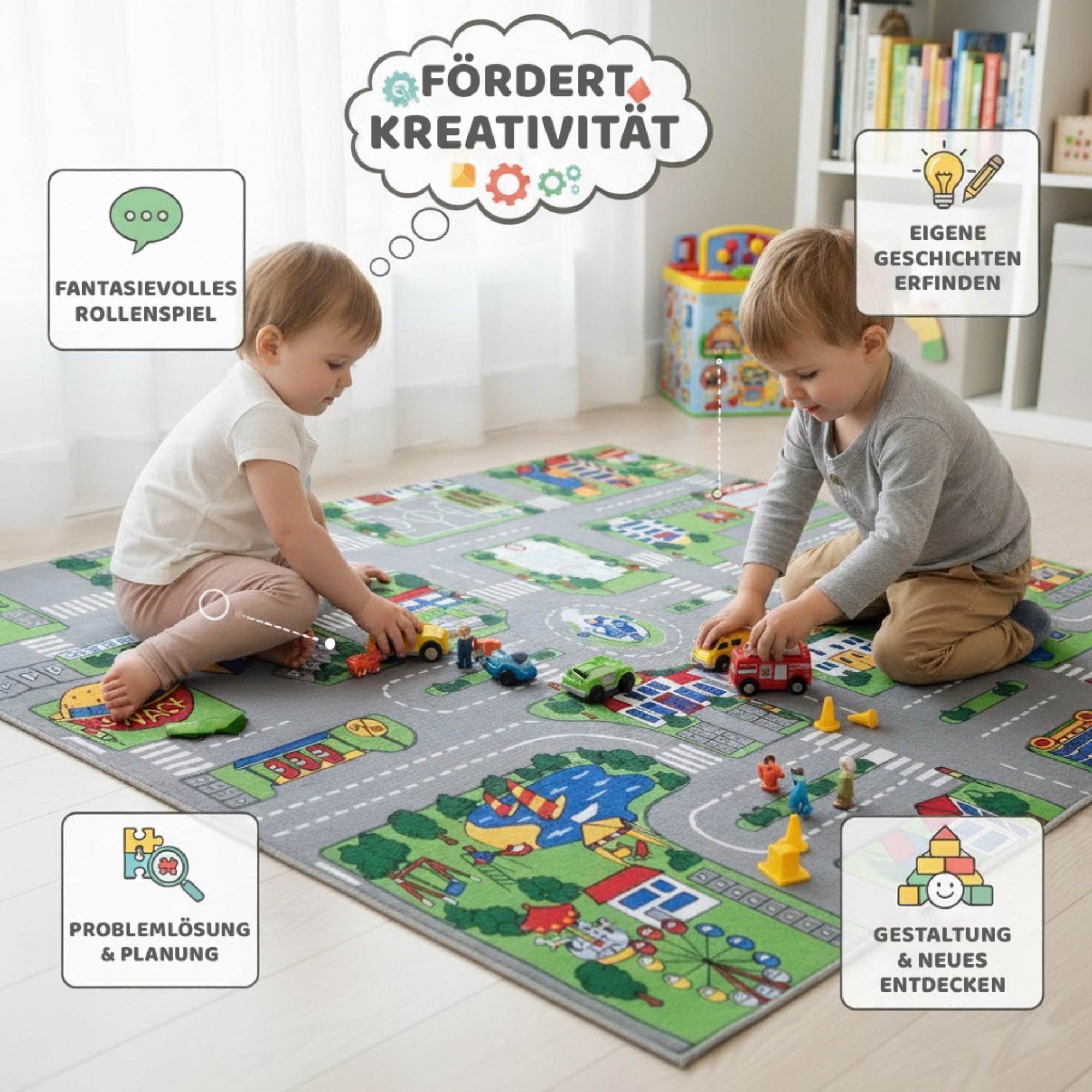 Der Spielteppich fördert durch seine Stadt- und Straßendrucke die räumliche Wahrnehmung und Kreativität Ihres Kindes, während soziale Interaktion und Rollenspiele die sprachlichen Fähigkeiten und das Verständnis für die Umwelt verbessern.