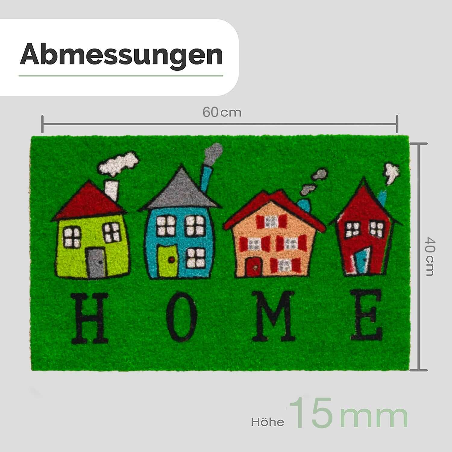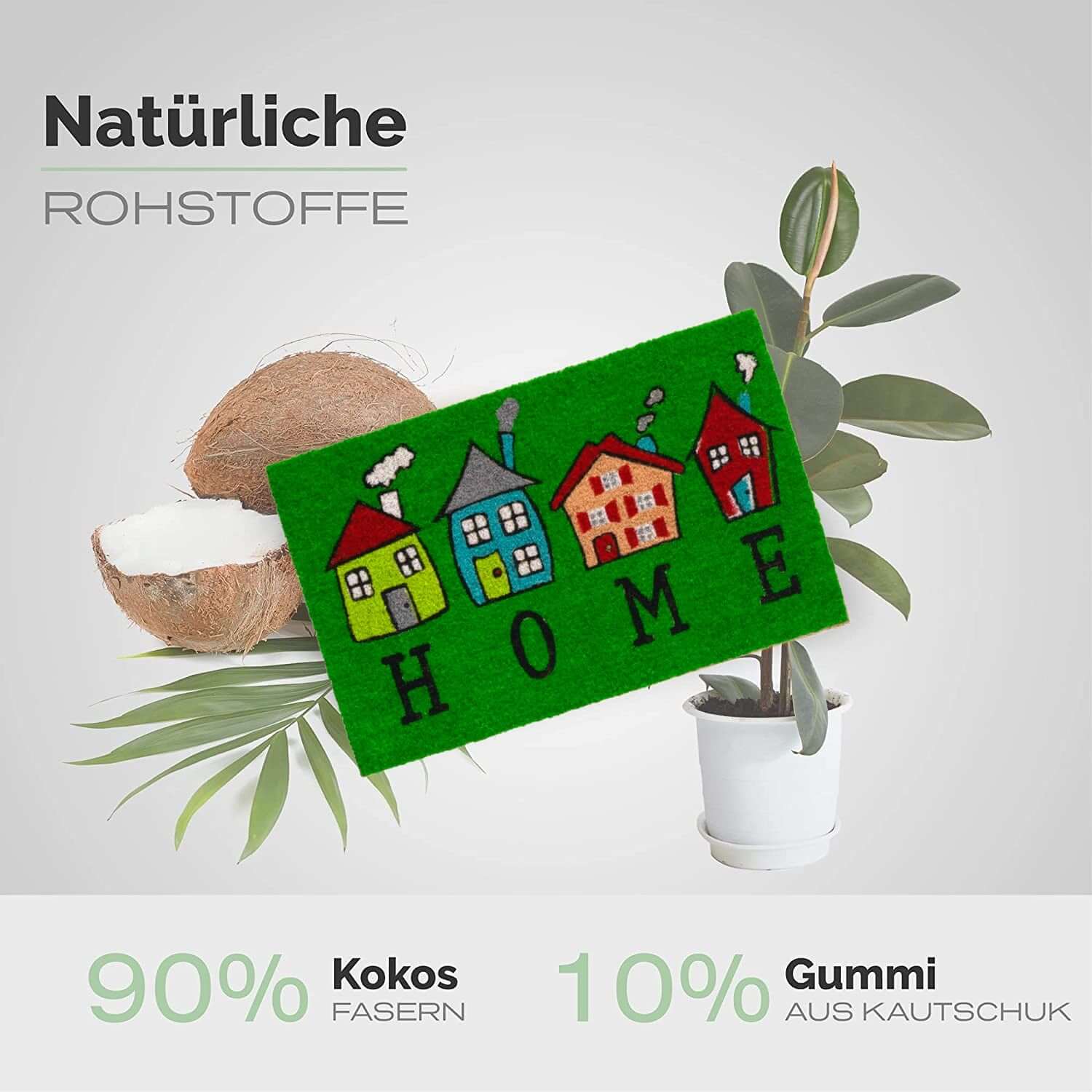 Fußmatte aus Kokos mit einem Motiv aus bunten Häuser und einer Home Aufschrift - ideal für den Eingang