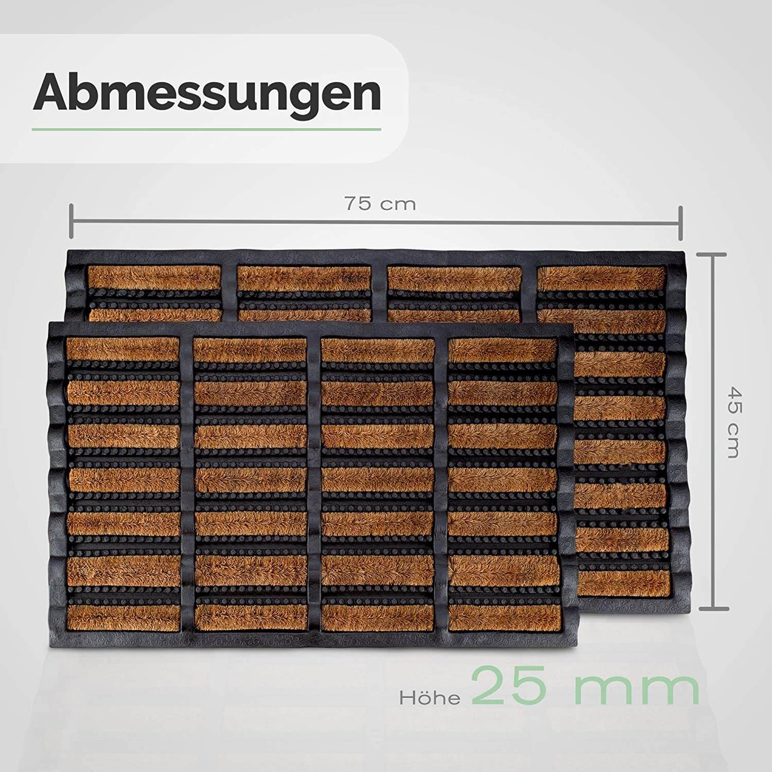 Die Fußmatte aus Kokos und Gummi ist in 2 verschiedenen Grössen erhältlich. Garantiert ideale Abmessungen für grosse und kleine Eingänge. Mit einer Höhe von 25 mm ist die Matte viel dicker als andere Fussmatten, was Sie umso robuster macht.